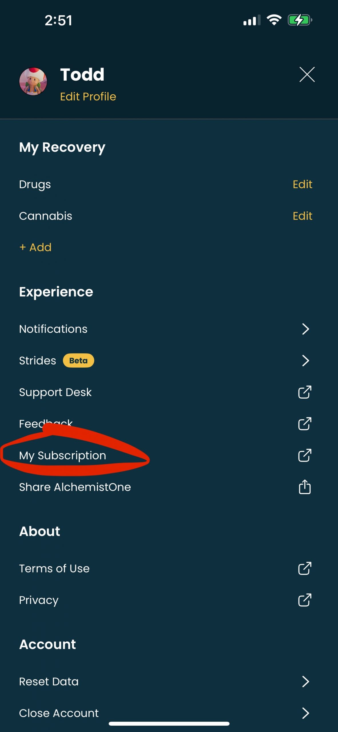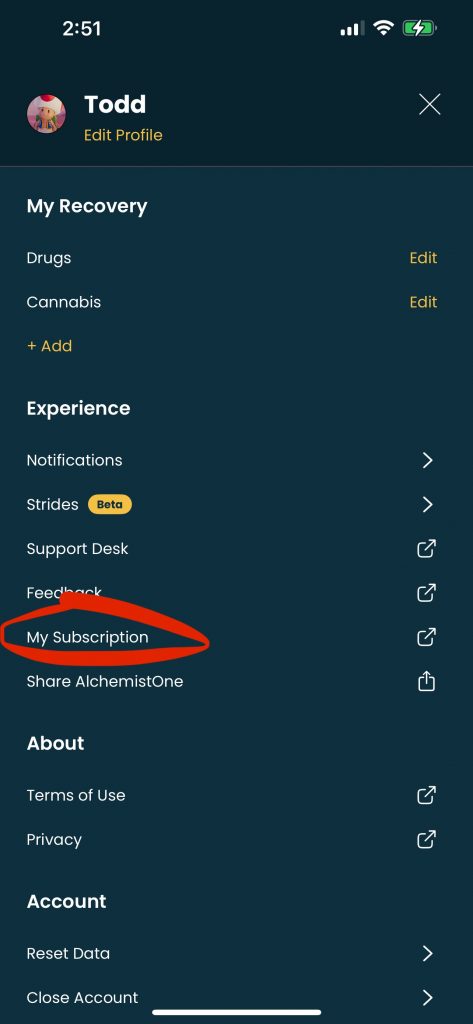 4. Find and tap AlchemistOne in your list of active subscriptions.